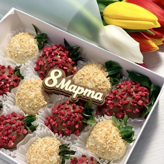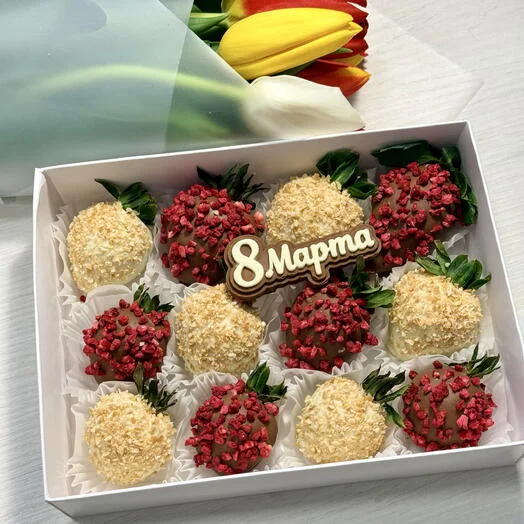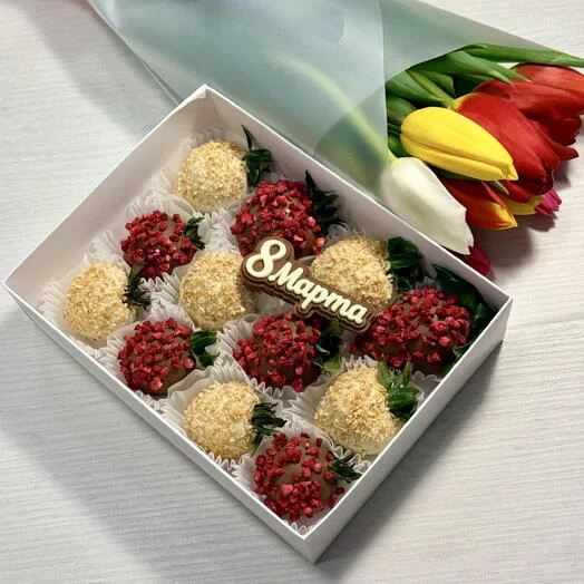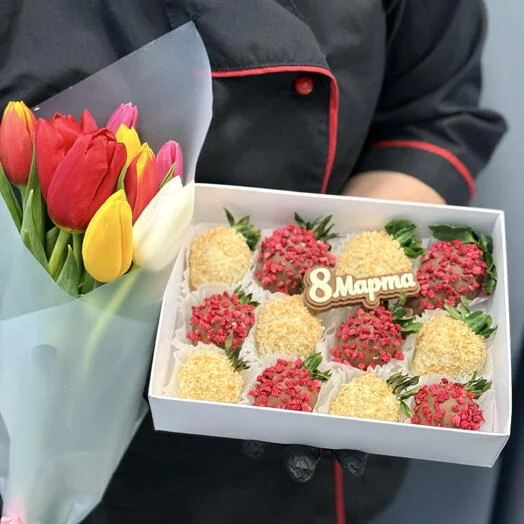 Комбо клубника в шоколаде 12 ягод и букет тюльпанов 9 шт на 8 марта!