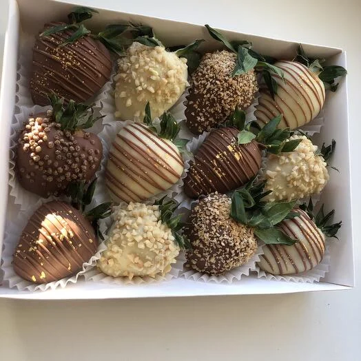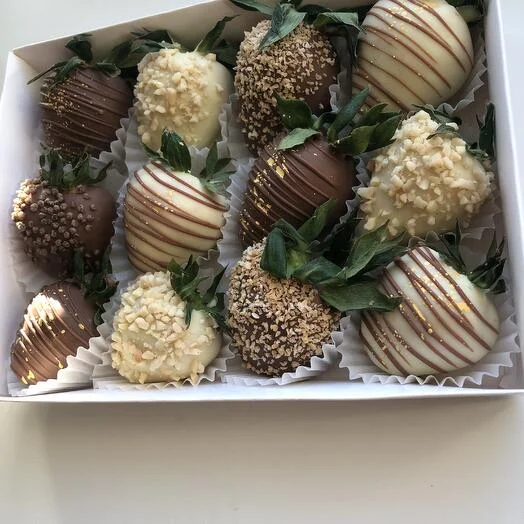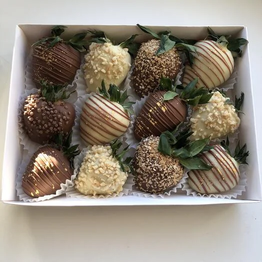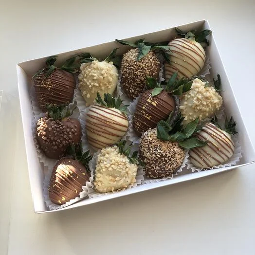 Набор из ароматной, свежей и отборной клубники - комплимент на любое торжество в качестве подарка. В дополнении с рисовыми шариками, дробленым орехом и вафлей - никого не оставит равнодушным.