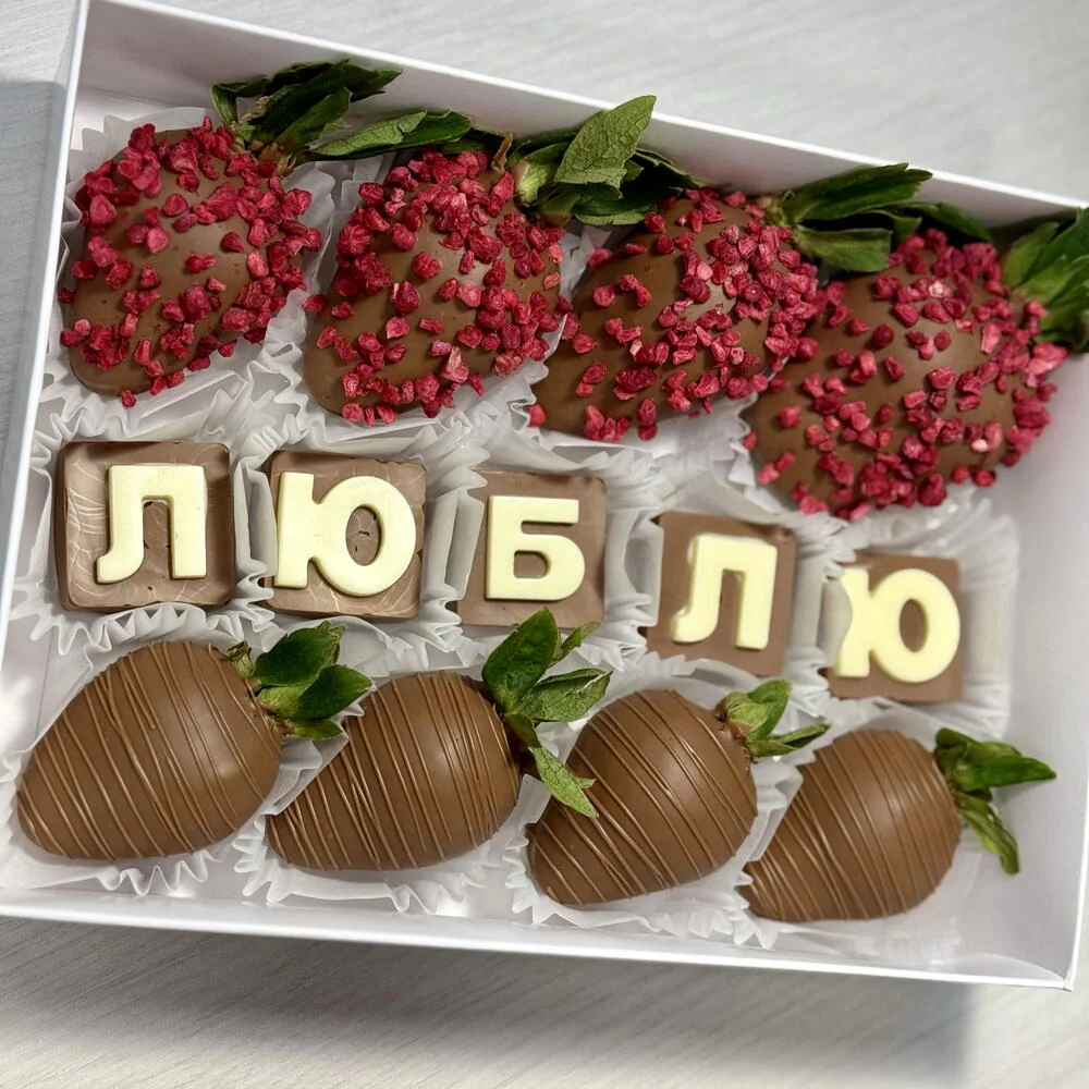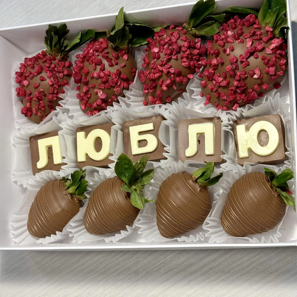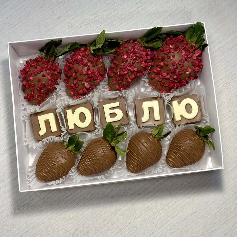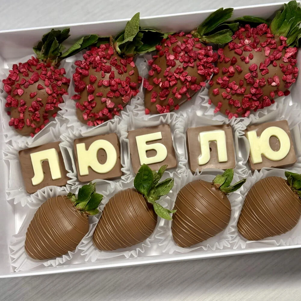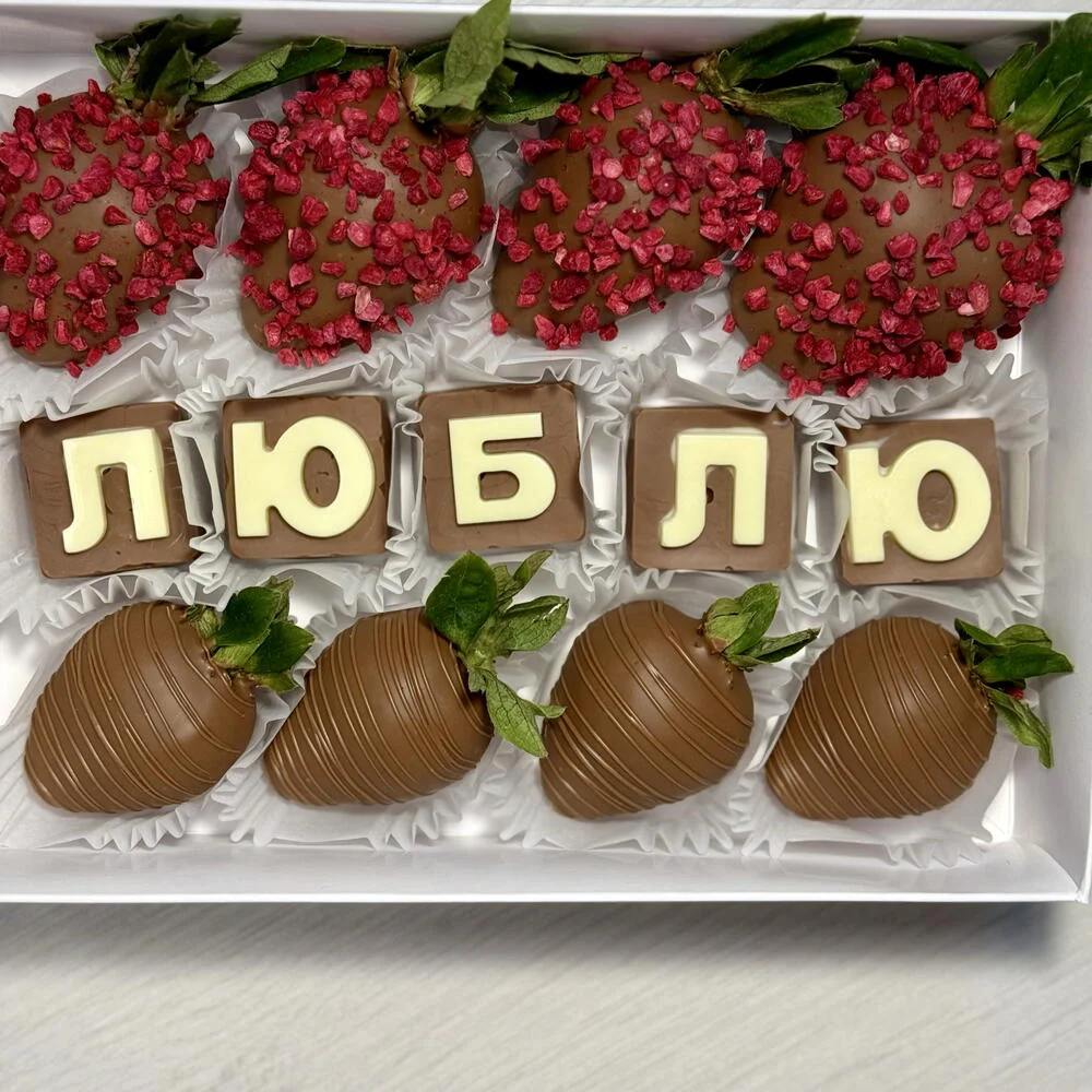 Набор клубники в молочном бельгийском шоколаде Callebaut. В коробке 8 клубник в зависимости от калибра ягоды с сублимированной малиной и в классическом варианте, а также буквы из бельгийского шоколада. Рекомендуем съесть клубнику в первые 12 часов после получения. Хранить в холодильнике при температуре +3 +5С не более 24 часов. Перед употреблением оставить при комнатной температуре на 15-20 минут. Приятного аппетита!