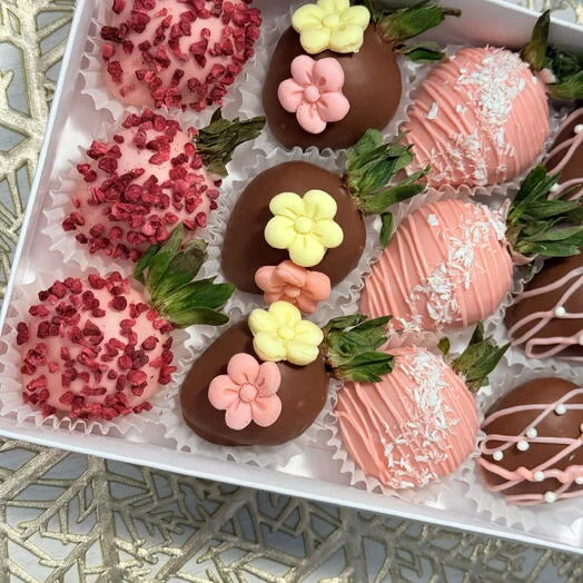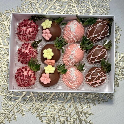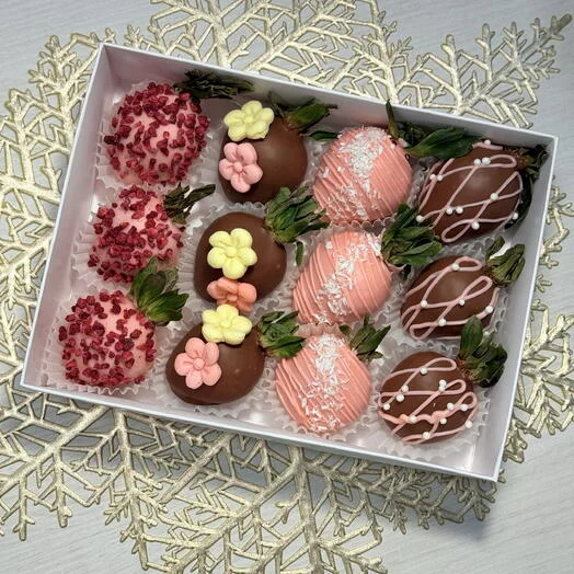 Набор из ароматной, свежей и отборной клубники - комплимент на любое торжество в качестве подарка. В дополнении с рисовыми шариками, дробленым орехом и вафлей - никого не оставит равнодушным.