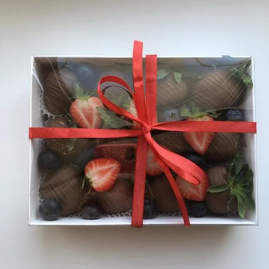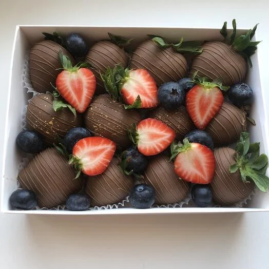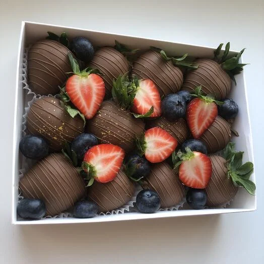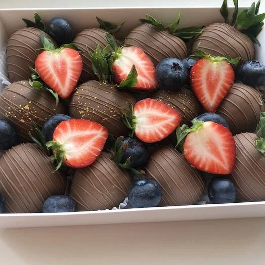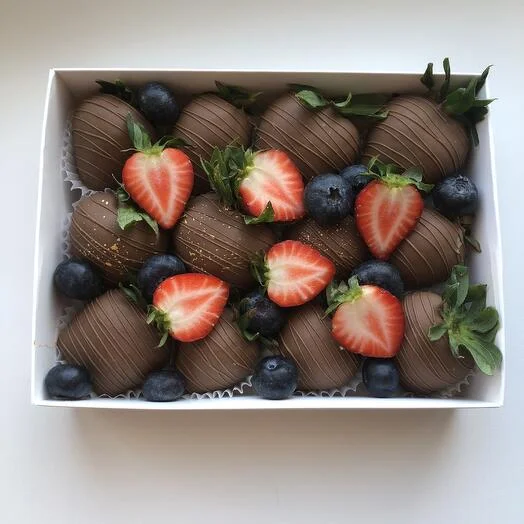 Только представьте: сочная, спелая клубника, окутанная бельгийским молочным шоколадом Callebaut. Свежая голубика добавляет яркие нотки к этому сладкому шедевру.