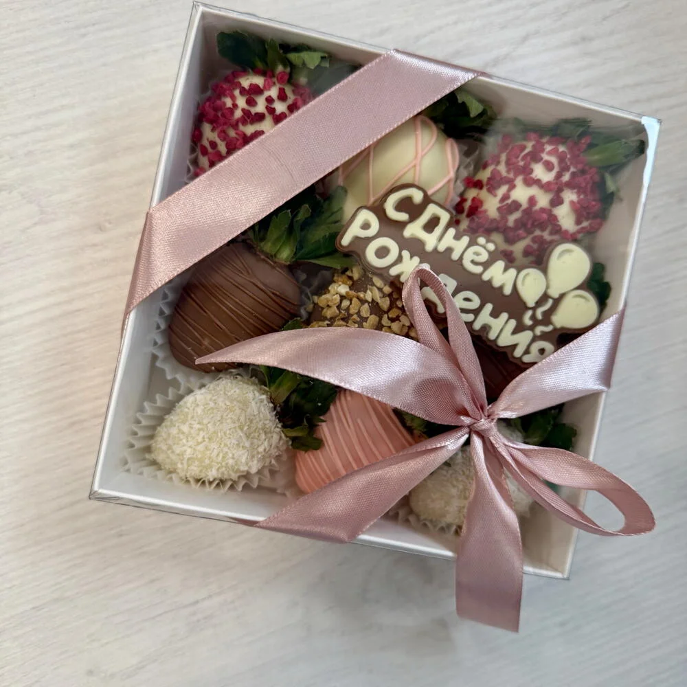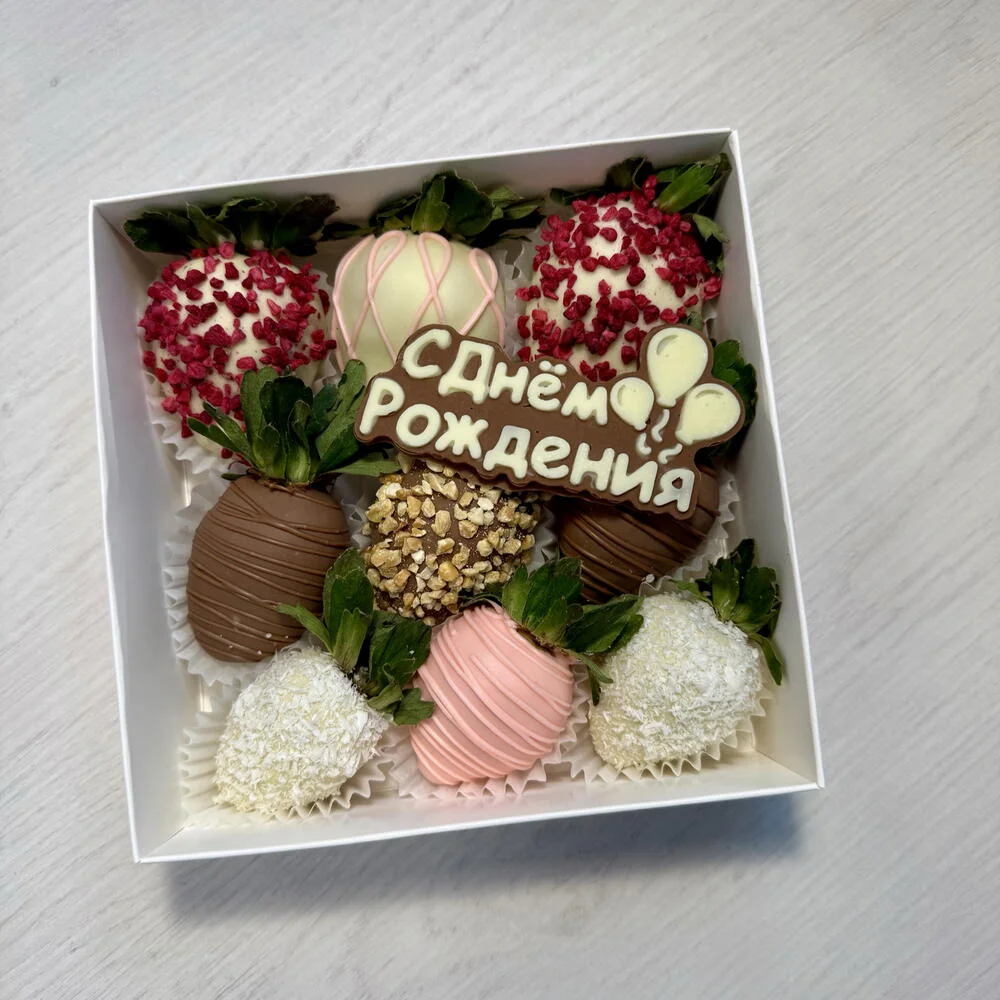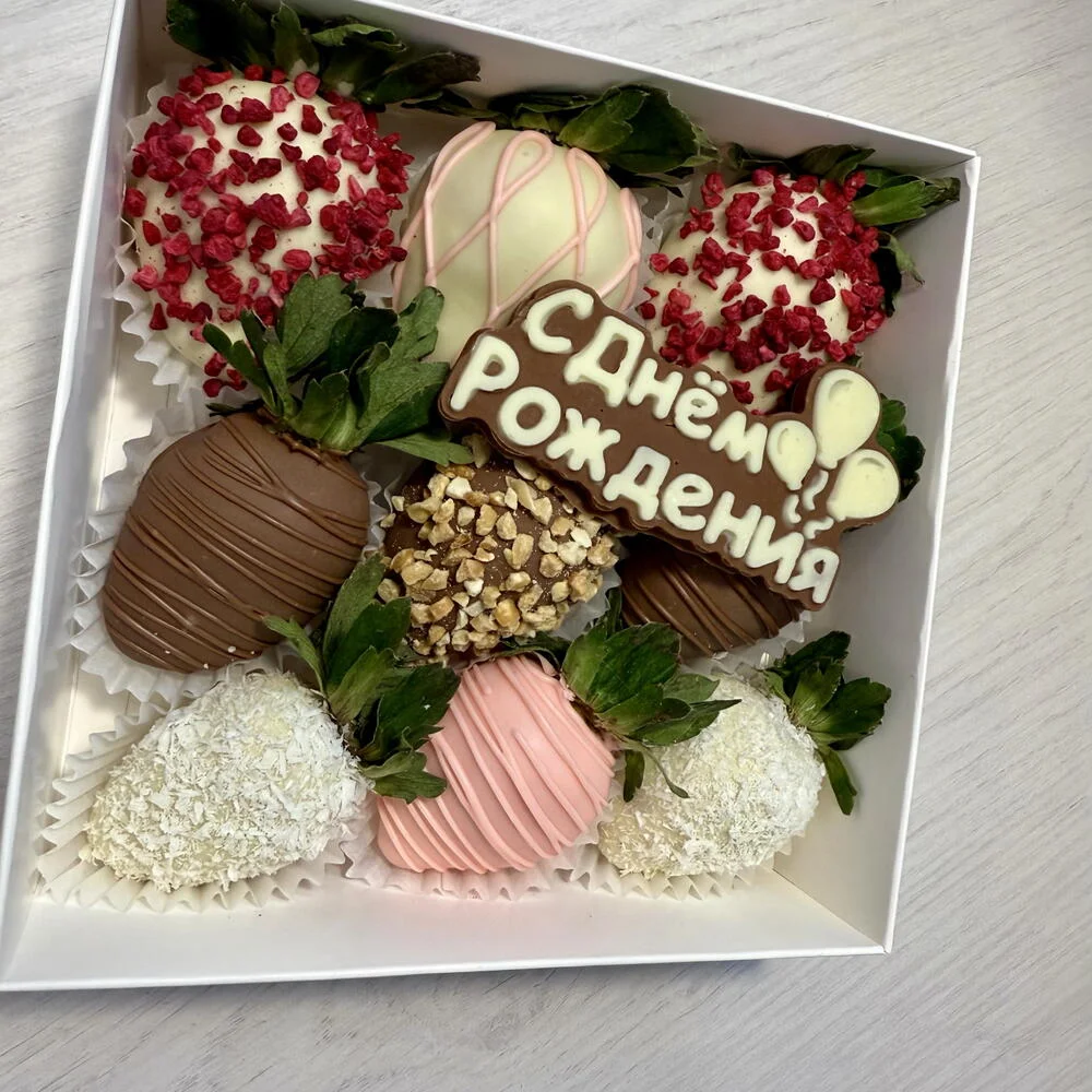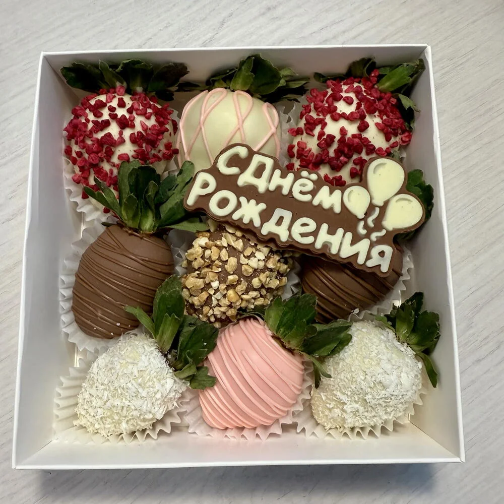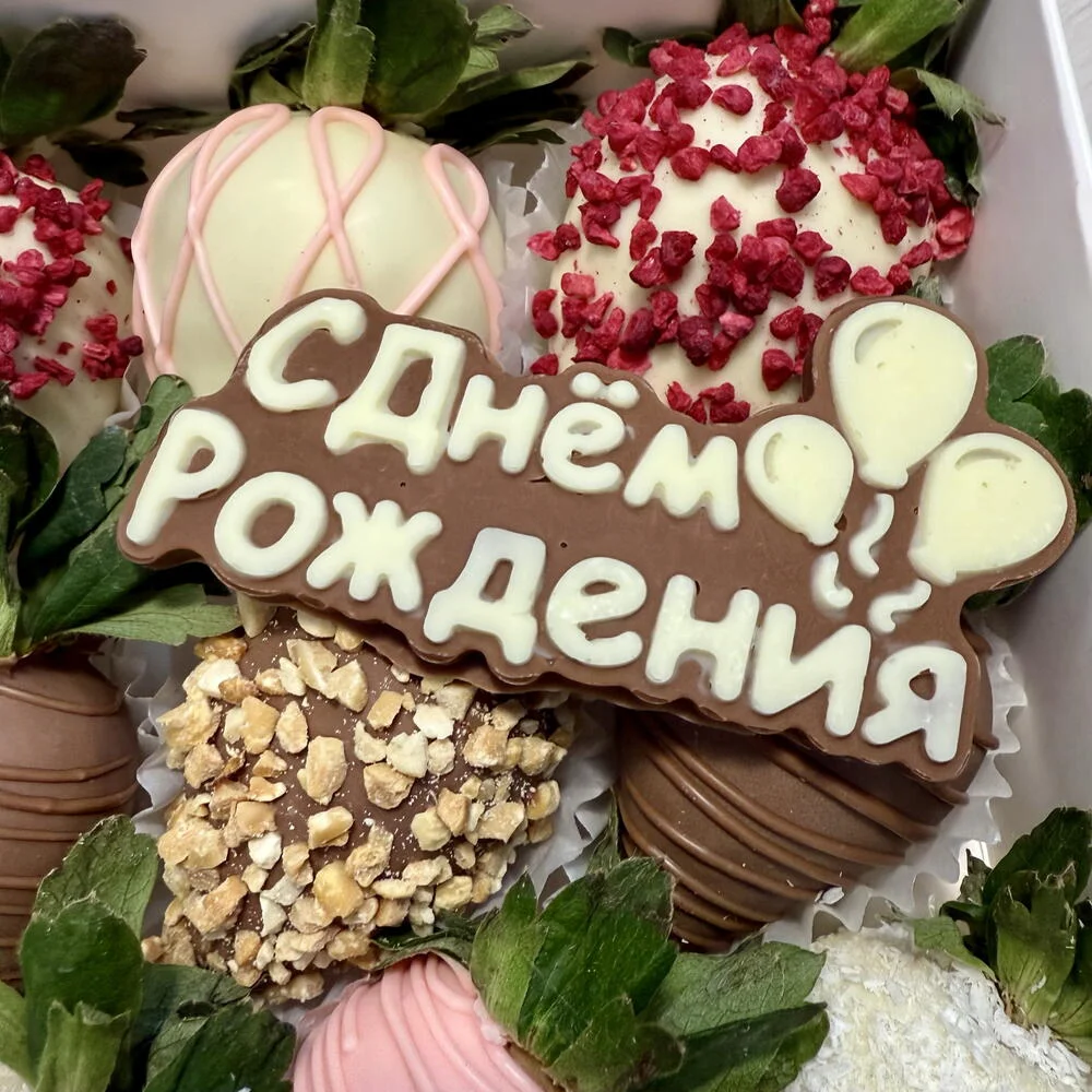 Дополнительные украшения: сублимированная ягода, кокосовая стружка, орех молотый. Молд из бельгийского шоколада С Днём Рождения. Подарочная коробка, атласная лента, открытка, пакет