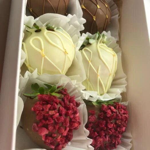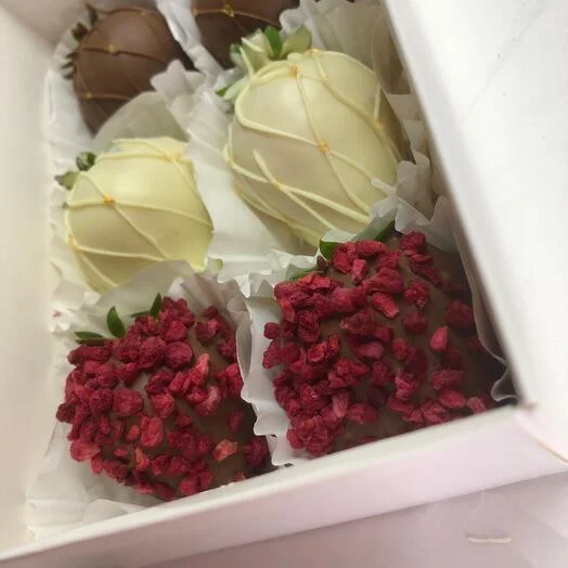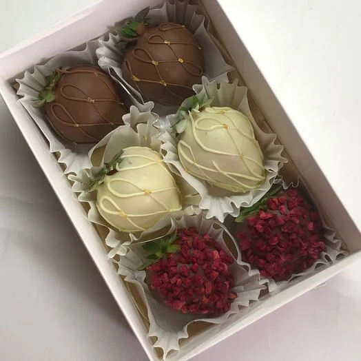 Количество ягод в наборе 6 штук.Каждый десерт упакован в коробочку и перевязан атласной лентой. Также открытка с вашими мыслями и пожеланиями, все это бережно упаковано в крафтовый пакет с окном.