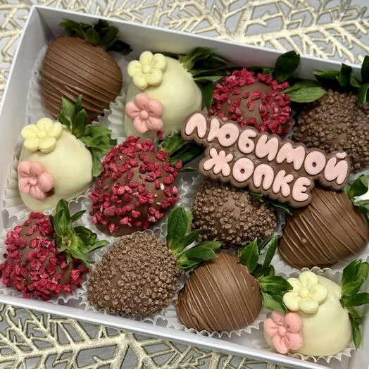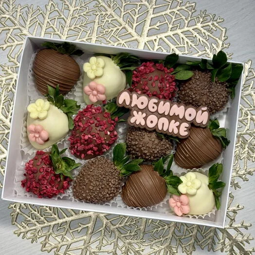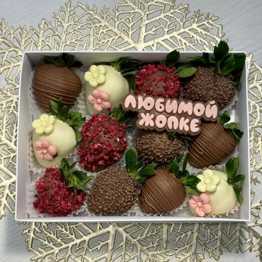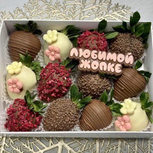 Набор из ароматной, свежей и отборной клубники - комплимент на любое торжество в качестве подарка. В дополнении с рисовыми шариками, дробленым орехом и вафлей - никого не оставит равнодушным.