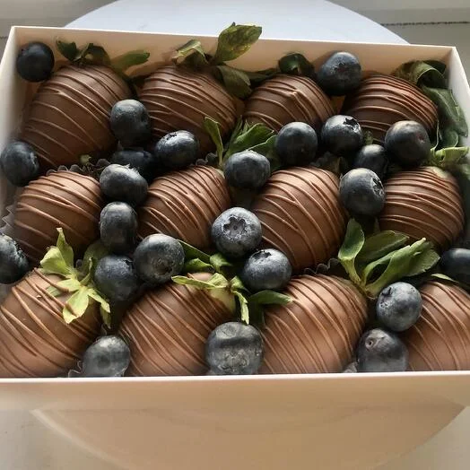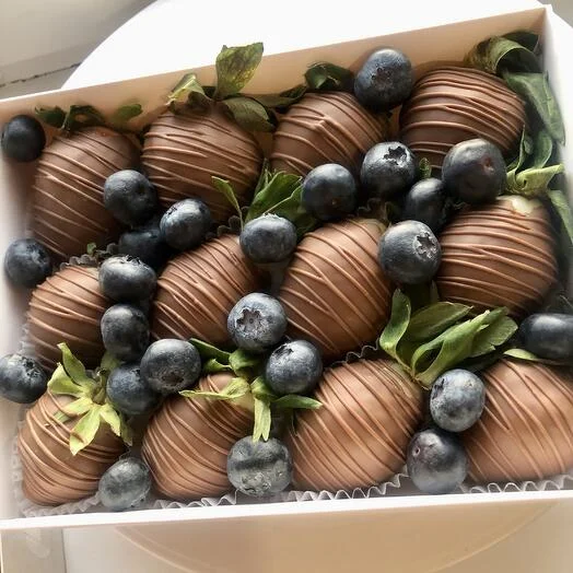 Этот набор - настоящий праздник для любителей сладостей! Он состоит из сочной клубники, покрытой молочным Бельгийским шоколадом. А украшением является свежая голубика, которая придает композиции свежий и яркий вкус.