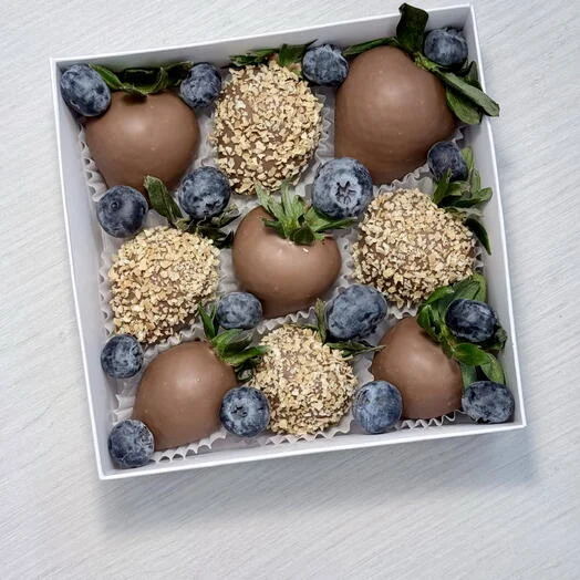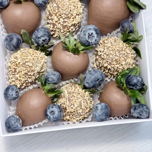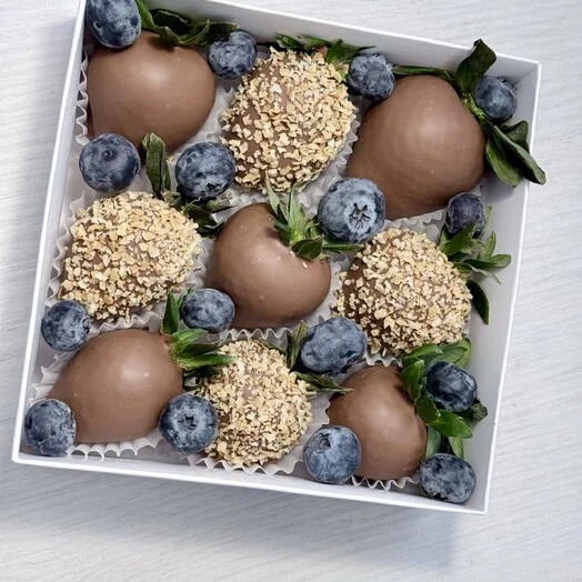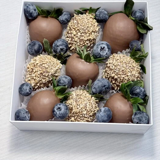 В коробке 9-12 клубник в зависимости от калибра ягоды с вафельной крошкой и голубикой.