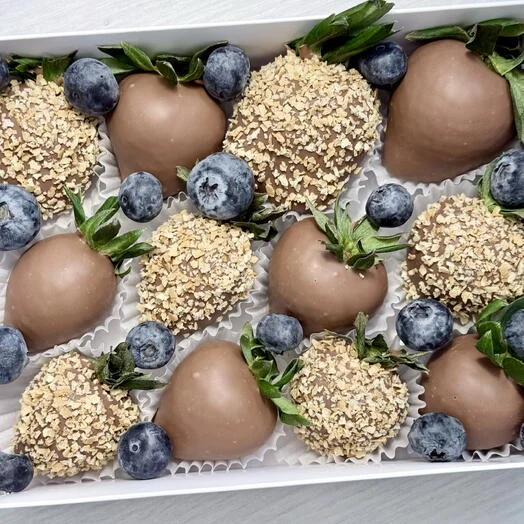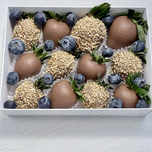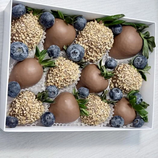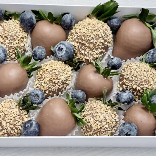 В коробке 12-15 клубник в зависимости от калибра ягоды с вафельной крошкой и голубикой.