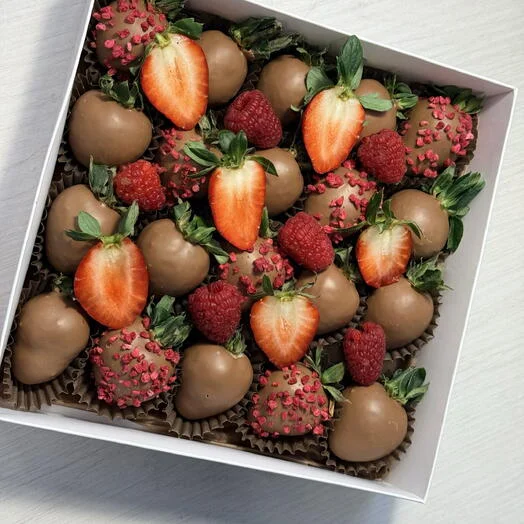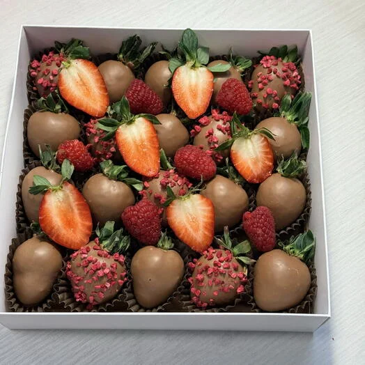 Яркий набор из 20-25 небольших клубничек в бельгийском шоколаде, украшенный свежей малиной и клубникой.