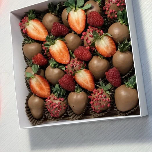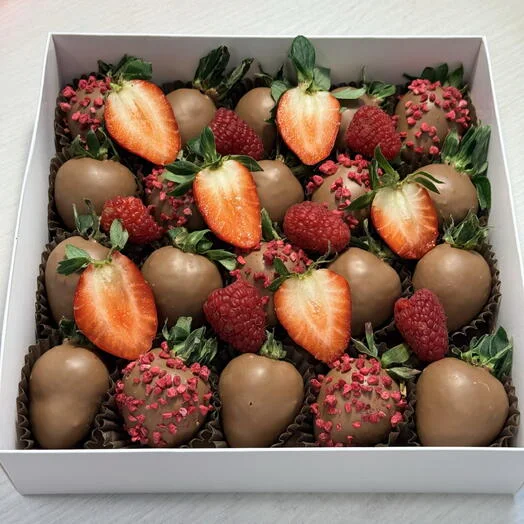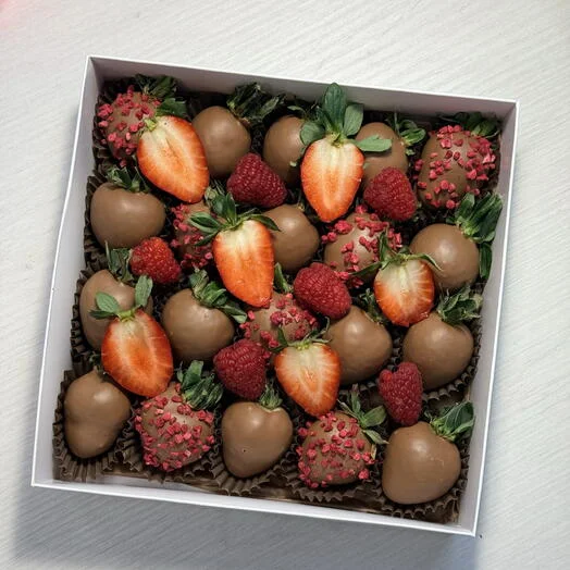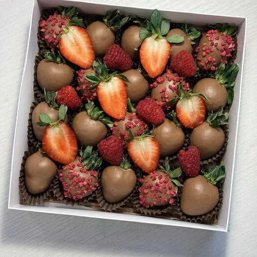 Яркий набор из 20-25 небольших клубничек в бельгийском шоколаде, украшенный свежей малиной и клубникой.