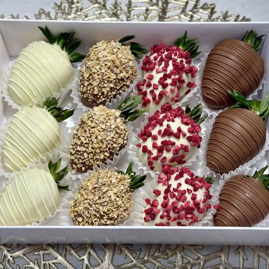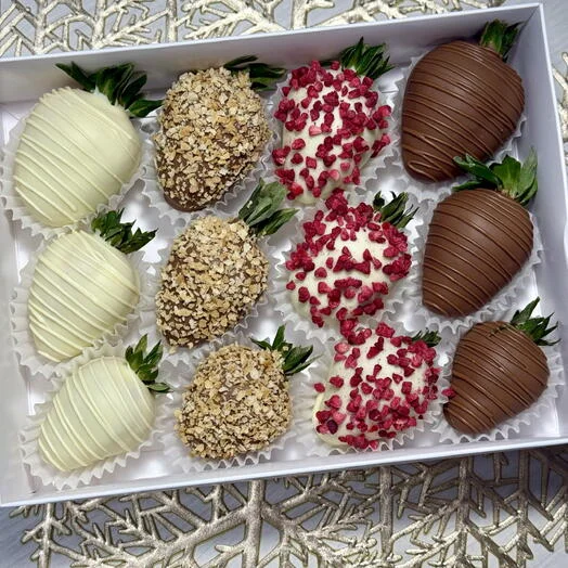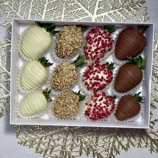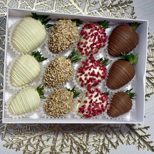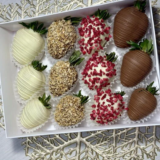 Подарочный набор клубники в шоколаде - нежность и утонченность, которыми хочется поделиться. В изящной коробочке 12 сочных ягод, оформленных в четырех аппетитных вариантах: