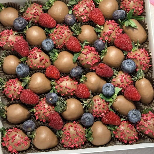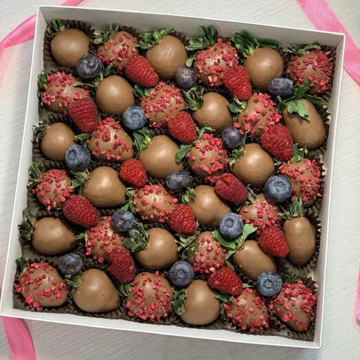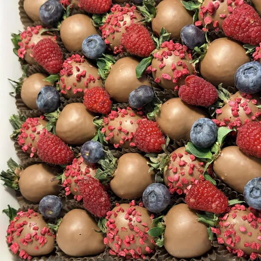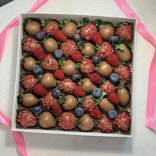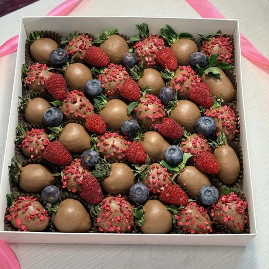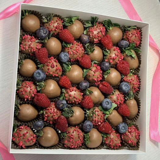 Яркий набор из 35-42 небольших клубничек в бельгийском шоколаде, украшенный свежей малиной и голубикой.