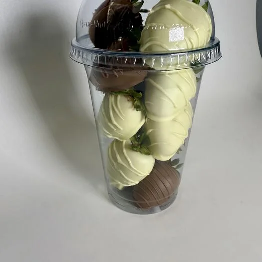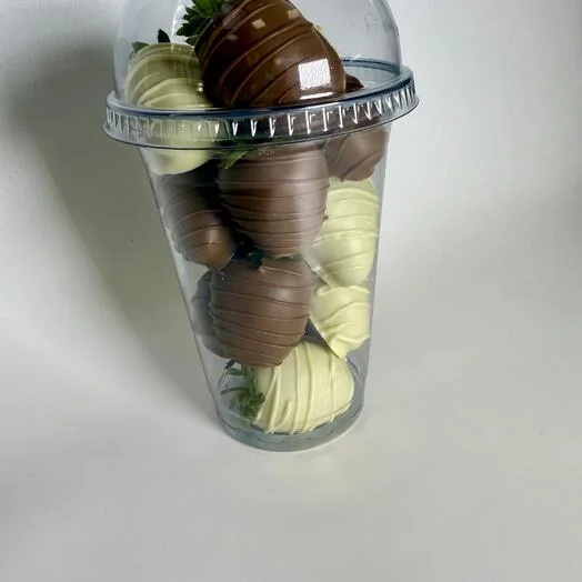 Стаканчик с клубникой в бельгийском белом и молочном шоколаде - отличное решение для тех, кто хочет сам насладиться сочетанием вкуса сочной, спелой клубники и натурального шоколада, при этом совсем не важна премиальная упаковка.