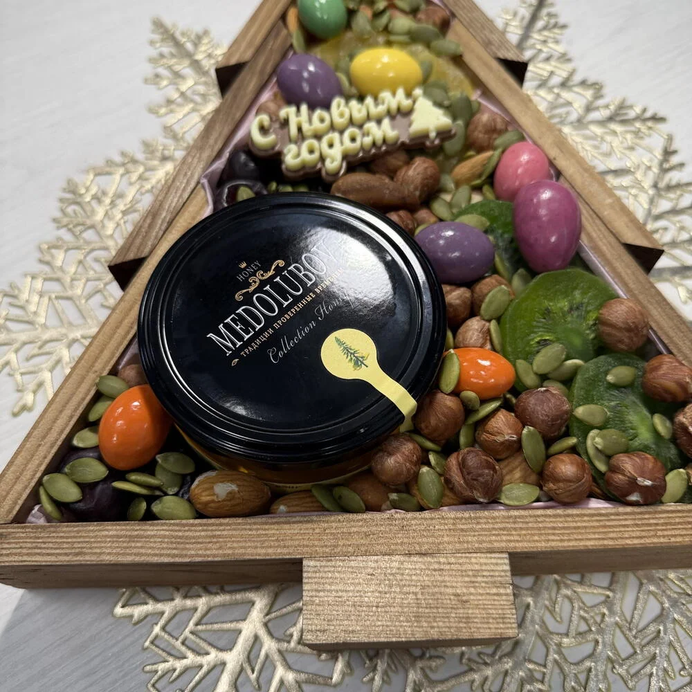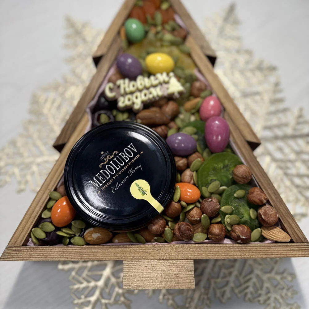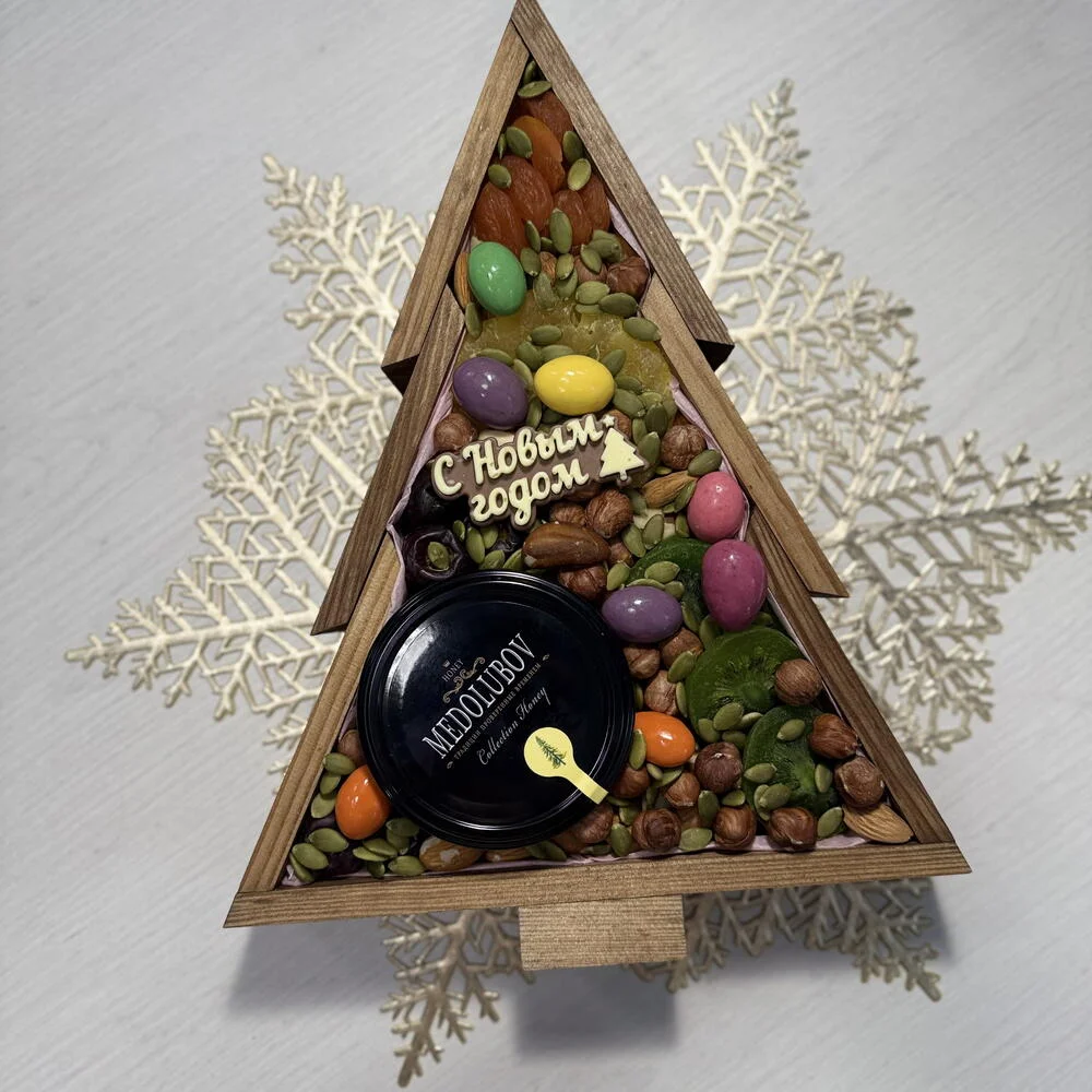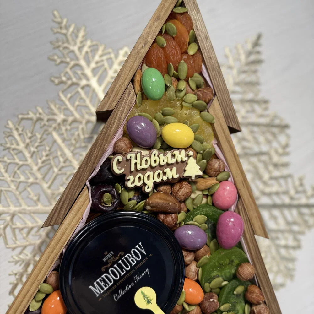 Преимущества упаковки: деревянная коробка‑ёлка из экологичной древесины безопасна и стильно смотрится в любом интерьере, её лаконичный дизайн подходит под разный декор, а удобная форма позволяет использовать её повторно для хранения сладостей или мелочей. Каждый набор дополнительно упакован в прозрачную плёнку и крафтовый пакет, поэтому подарку не требуется дополнительное оформление — его можно сразу дарить или отправлять получателю.