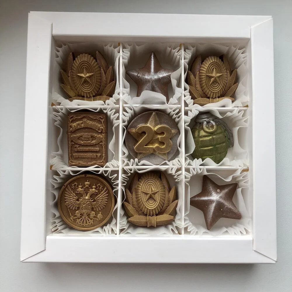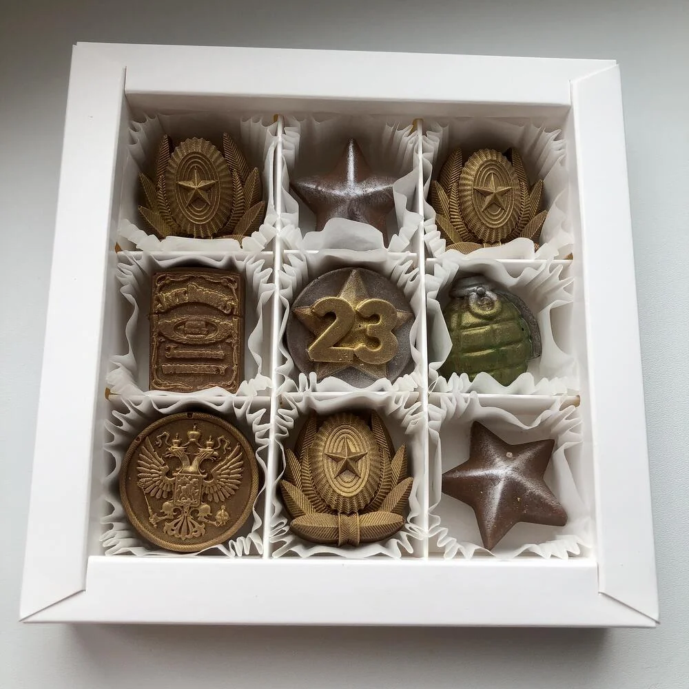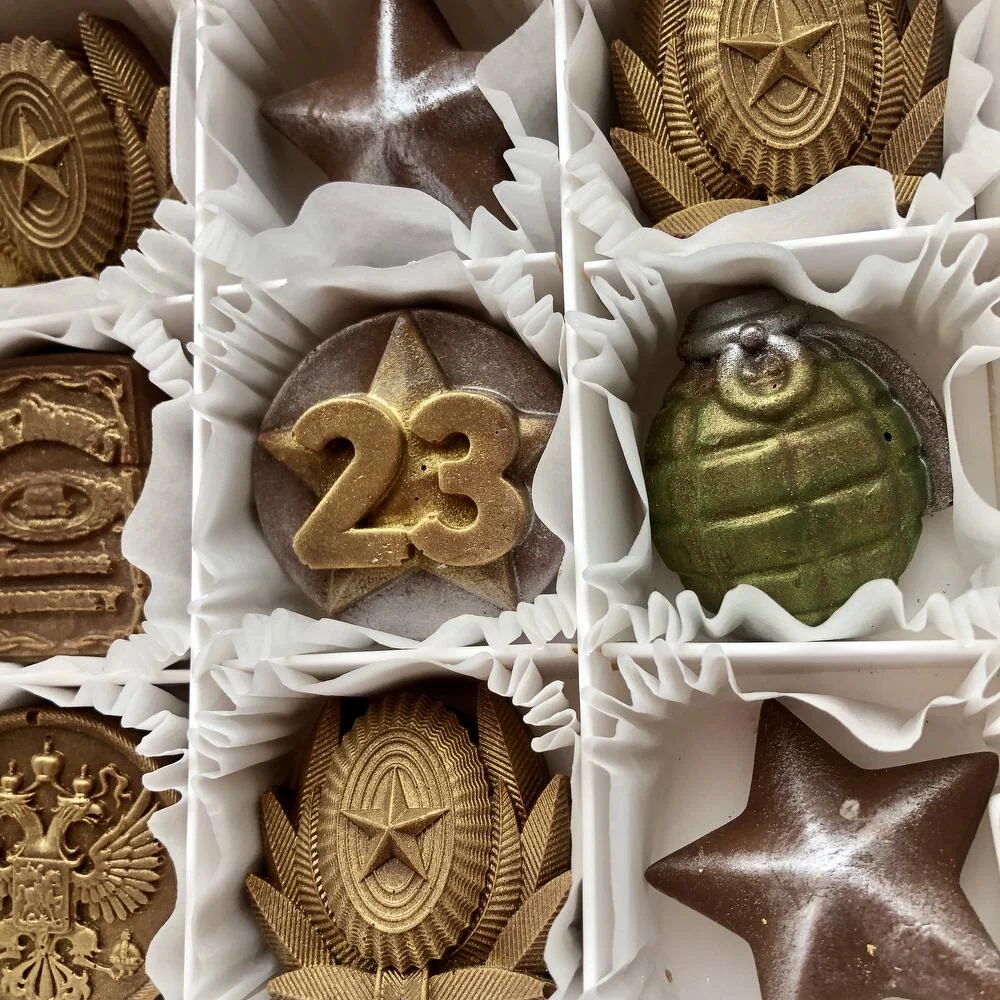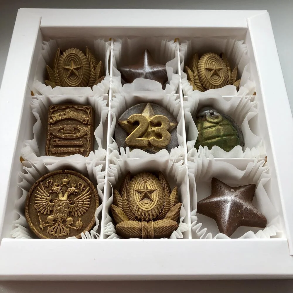 Набор из 9 шоколадных конфет в бельгийском шоколаде станет отличным подарком как коллегам так и близким: папе, сыну, другу, дедушке. Каждая конфета оформлена в армейском стиле. Уникальные формы и оригинальные вкусы порадуют даже самых искушенных сладкоежек. Этот набор станет не только прекрасным угощением, но и стильным украшением праздничного стола!