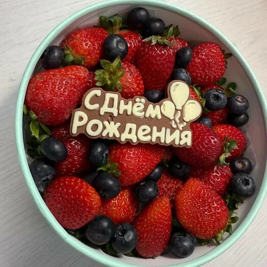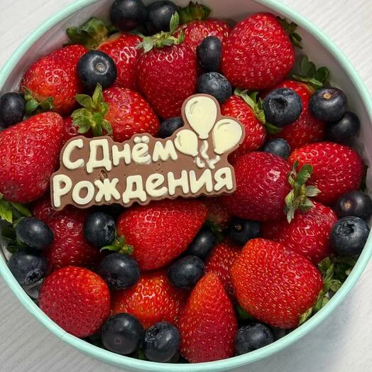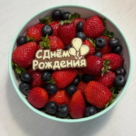 Свежая клубника в сочетании с голубикой и надписью из шоколада С Днем Рождения в круглой коробке