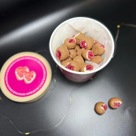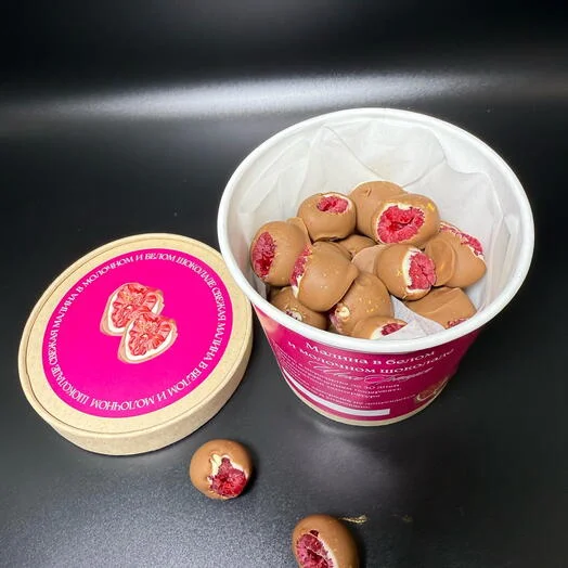 Та самая отборная малина в белом и молочном бельгийском шоколаде. Насладитесь изумительным вкусом свежей малины в шоколаде.